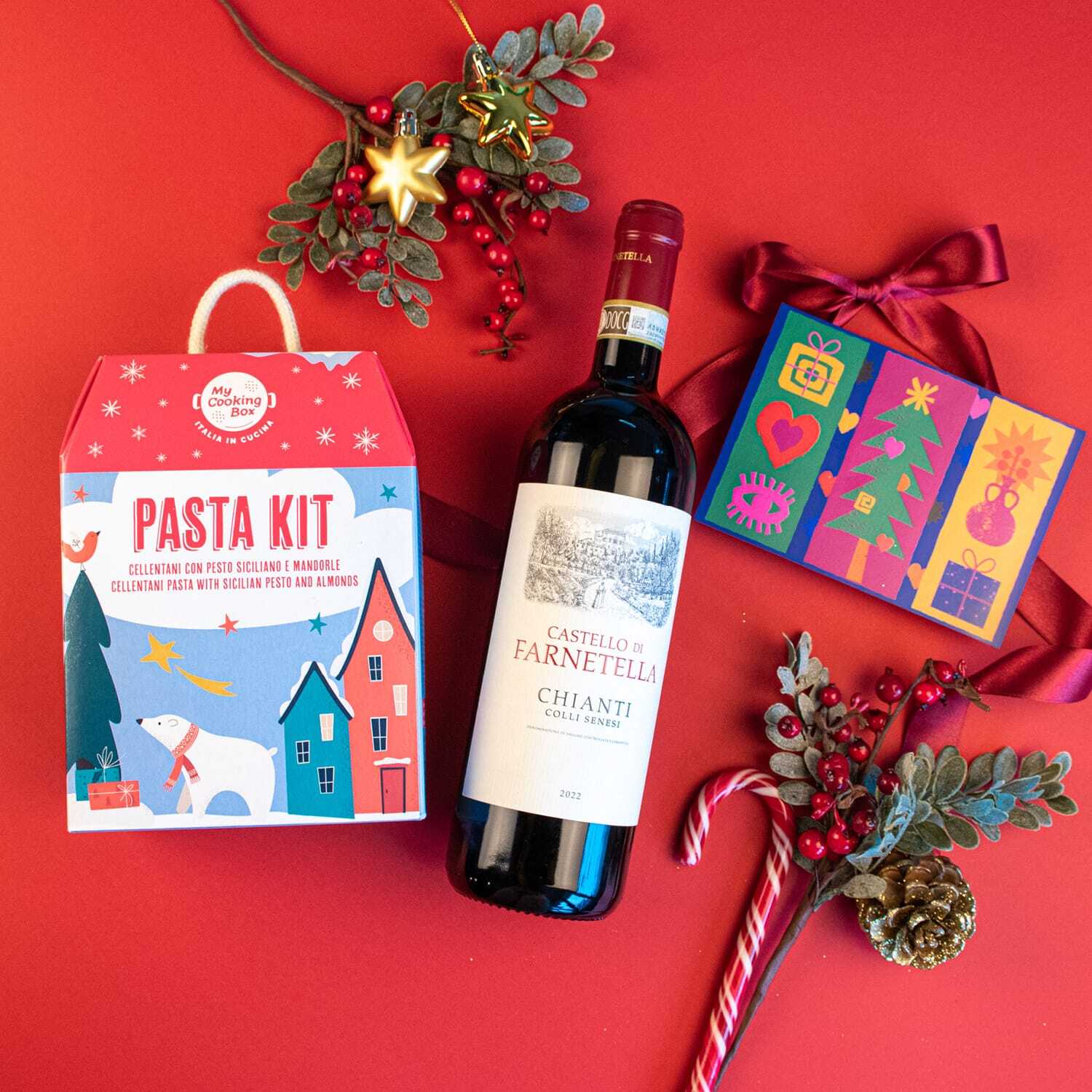 Completano questo speciale cesto di Natale la nostra Box Cellentani con pesto siciliano e mandorle in edizione limitata e una bottiglia di Chianti Colli Senesi DOCG Castello di Farnetella.