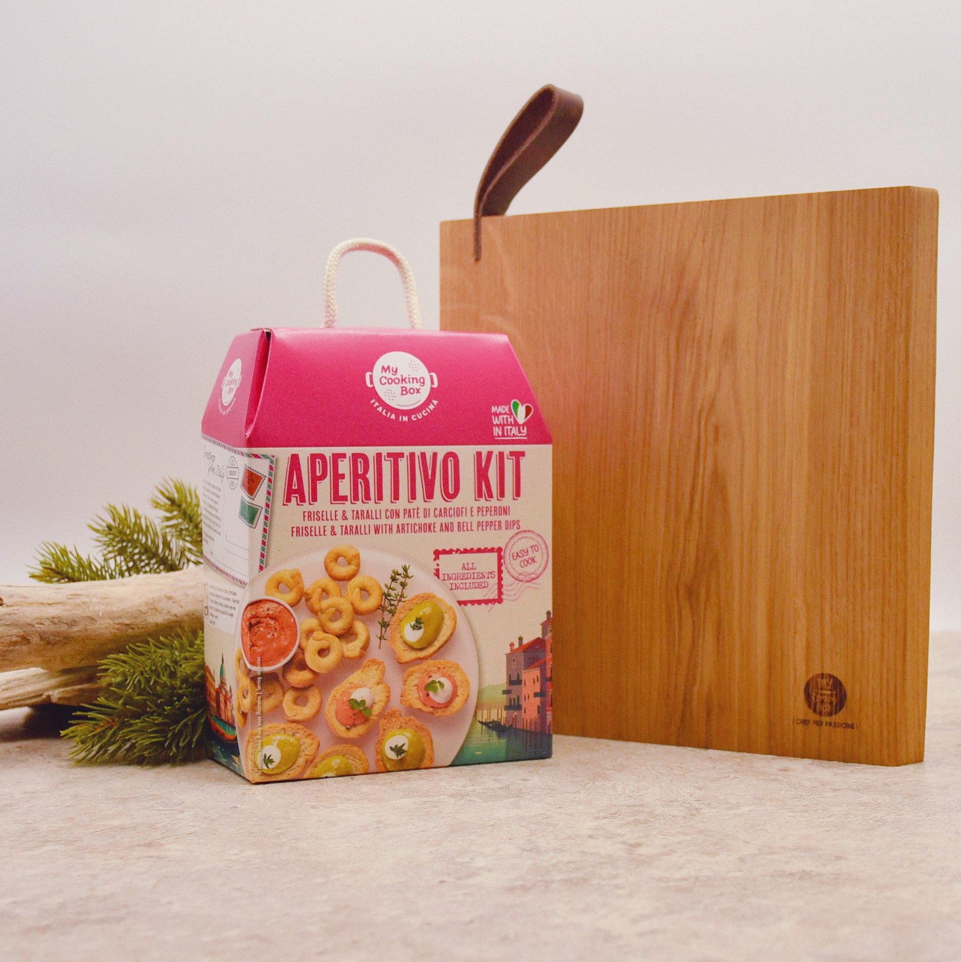 C'è solo un rituale che accompagna tutte le cene di Natale: l'aperitivo! Riscopri il piacere di un buon aperitivo fatto in casa con questo speciale kit natalizio: taralli e friselle pugliesi con due paté di verdure servite sull'iconico tagliere in legno di quercia firmato My Cooking Box.