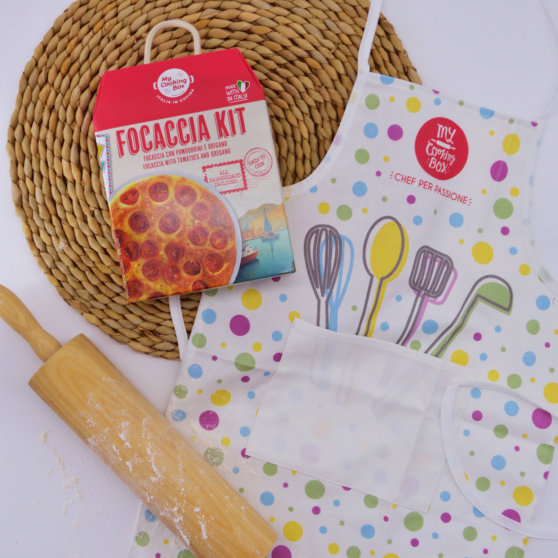 Il regalo di Natale perfetto per i più piccoli che amano cucinare! Un’occasione per divertirsi insieme a impastare l'autentica focaccia barese con pomodorini, indossando un grembiule per bambini su misura.